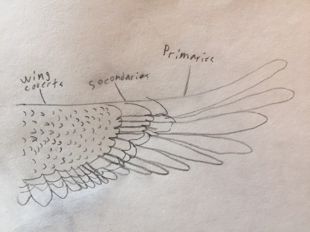 In this blogpost I will talk about types of feathers and their purposes. I’ll start with the flight feathers, the primaries (the ones on the edge) are for lift, brakes, sometimes attracting mates and warnings. Under the primaries, the secondaries are smaller but bigger than the wing coverts. Last of all the flight feathers the wing coverts are used for warmth for the wing. I picked the wing feathers first because you can see them from every angle, front, back, above and below.