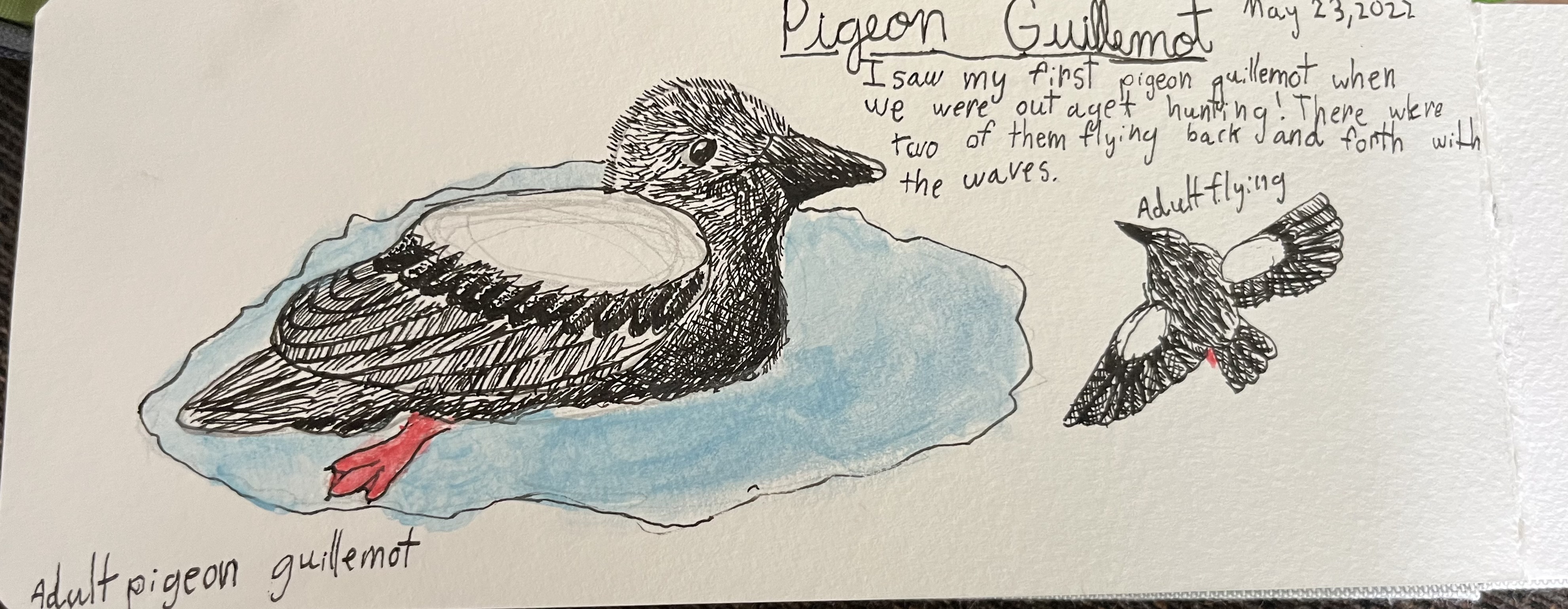 The best part about the trip is that I forgot my camera! Even though I forgot my camera we still have pictures and drawings of really cool birds like the Caspian Tern, Pigeon Guillemot, Double crested Cormorant, and Whimbrel. In my opinion, trying to identify birds without my camera is more fun and challenging.
