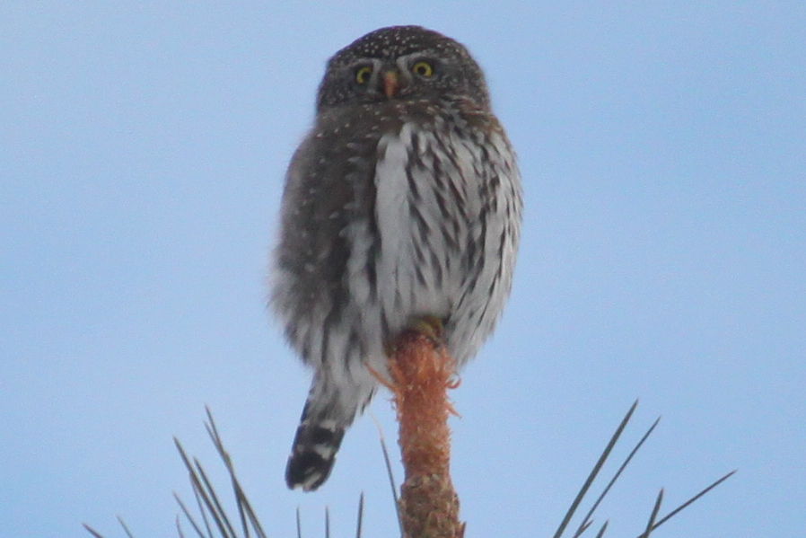 Identification. Around 7″ long, the Northern Pygmy-Owl (Glaucidium californicum) has a white belly with distinctive black streaks running vertically through it. It has a brown head, wings, and tail. Bright yellow eyes with black pupils are located near the beak (the beak of the pygmy-owl in the picture above has a slightly bloody beak) which is peachy colored.