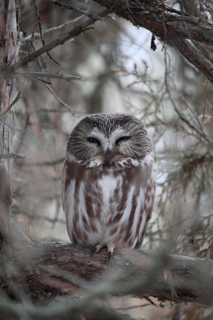 I knew that Northern Saw-whet Owls liked junipers, I knew how small they were, at least I thought I did. I branched off the trail to a smaller path that had junipers. It looked promising. We continued, searching every juniper I saw. We had just finished searching this tall, wide one when Mom said ” Look what I found”. She opened her hand and revealed a tiny gnome.