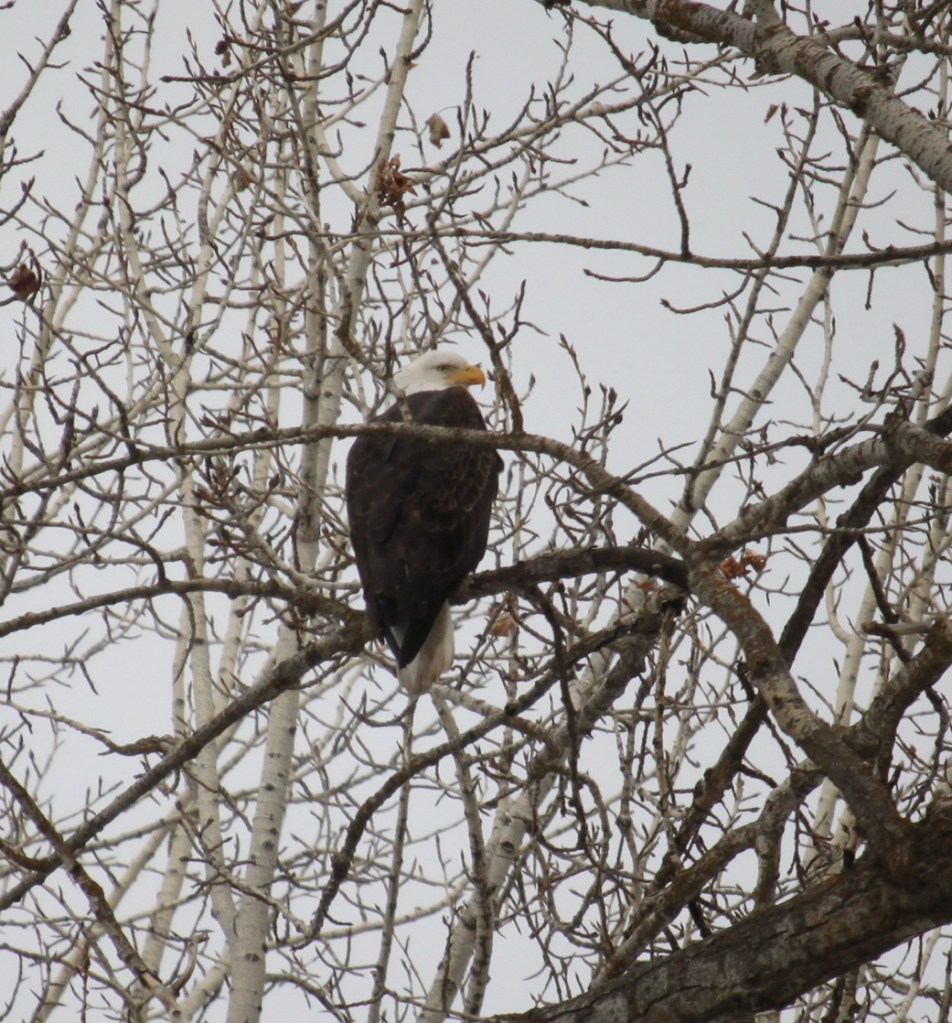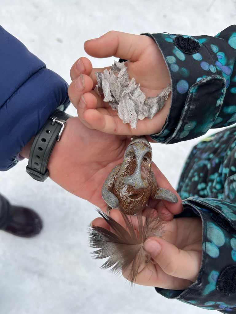 To me, Tower Street means eagles which are by far my favorite birds, but as we walked up the hill, no pearly white heads or chocolate brown wings greeted us. Papa scanned down stream, all the eagles had congragated on an ice flow near the bend. We kept walking when a feather drifted down.
