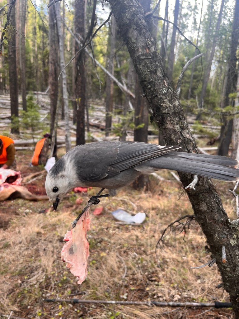 Recently, my family and I travelled to the middle fork of Rock Creek for our annual elk hunting trip. We shot a cow on our last day before heading back to Missoula. Papa came and got us so we could help butcher the elk. Before I could see the elk, I saw the silvery feathers of a Gray Jay. There was a pair of Gray Jays fluttering around her and diving down to pick up fat with their beak. The bouncy ball sized pieces of fat they were carrying made me wonder how the jay could carry such a big thing. A study done by Lynn Rogers found jays normally carry food with their beaks unless the load is greater than 40% of their body weight. On the occasion they do carry items larger than 40%, the Gray Jay will transfer the load to their feet or drop it. So the pieces of fat being cached by the Gray Jays had to be less than that amount or they wouldn’t be carrying it with their beak. I noticed the Gray Jays were fearless, swooping in to grab pieces of fat mere feet from us. I took a piece and hung it on a nearby tree, standing a foot away with Mom’s phone. Finally one showed up and stood there trying to get the fat off the stick. I took pictures for 15 minutes before I came over to help butcher the elk. They were still caching fat when we left.