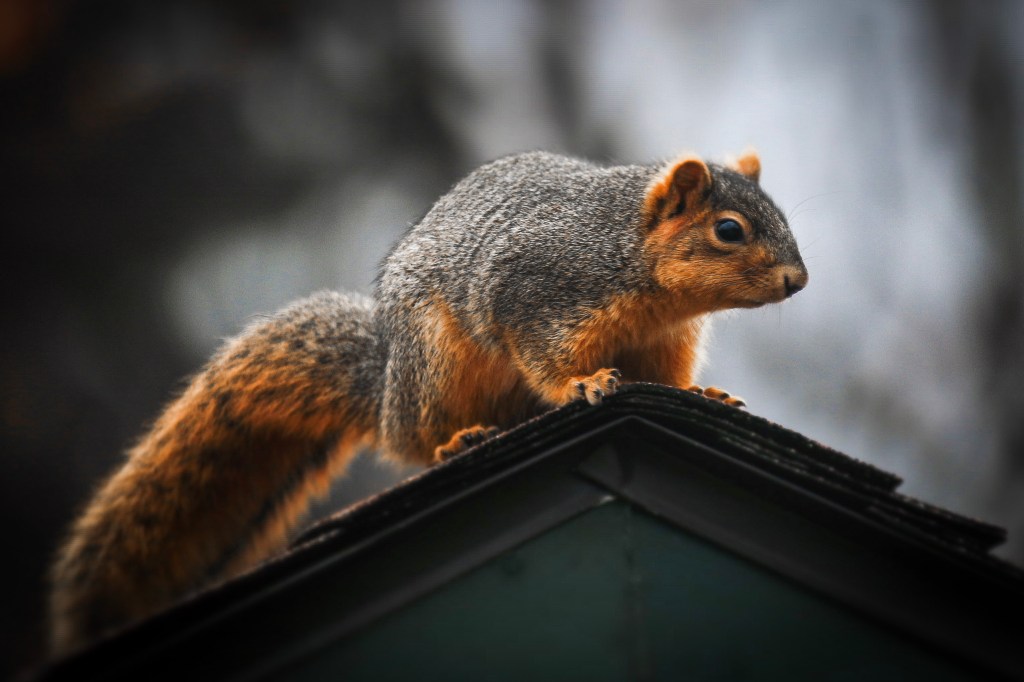 If you have a bird feeder, you also probably have a few resident squirrels. I had just sat down to eat when I leapt up again, grabbed my camera and raced into the attic, where I could get an eye-level view of the squirrel that had just appeared. I watched it for a minute or two before it shook its tail and raced down the roof.
