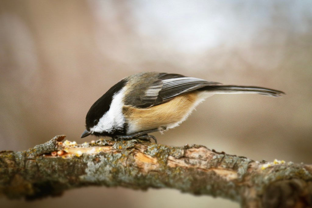 After years of watching chickadees do their thing, I have learned that they will only eat sunflower seeds. Knowing this, I stashed sunflower seeds throughout the lupine branch. I captured this photo just as the chickadee checked if any seeds survived the frenzy of hungry relatives.