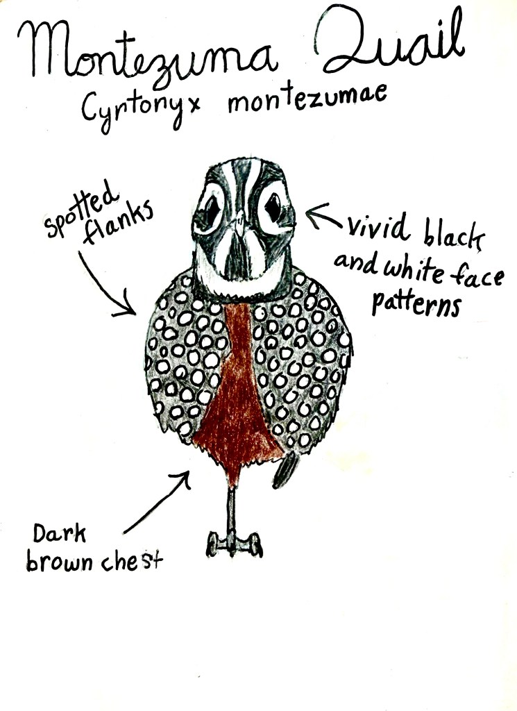 The Montezuma Quail (Cyrtonyx montezumae) is a heavily patterned quail that resides in the mountain grasslands and woodlands found in Mexico and the southwestern United States. The male and female are nearly identical. The female’s call is described as “a quavering, descending series of metallic whistles with an otherworldly quality” (All About Birds). The call of a male Montezuma Quail is thought to resemble an insect, a buzzing sound that is similar to the females in quality. The flanks of the quail are heavily spotted, and a brown stripe runs down the chest. The face is heavily patterned as well, with vivid black and white markings covering the entirety of the birds head. Personally, I would call it a Vivid Quail or a Whistling Quail, although you should make up whichever name that you feel suits the bird best.