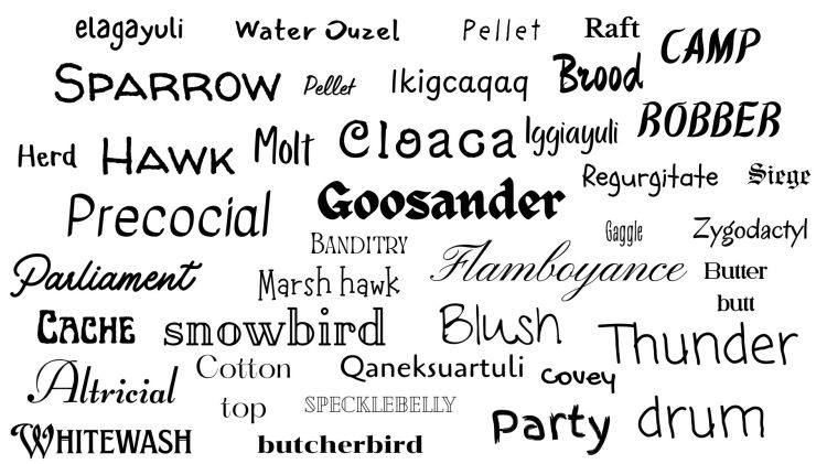 Seeing as birding is one of the most popular hobbies in the United States, sciencey people and collectors have created LOTS of words describing behavior, or plumage, or anything else that can have a name. This section is dedicated to all the bird-words you may or may not have ever used in a sentence.